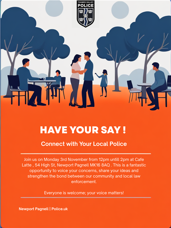 Your local Neighbourhood Team will be at Café Latte, 54 High Street, Newport Pagnell from 12pm-2pm on Monday 3rd November . Please take this opportunity to raise any concerns you may have and to find out what we are doing to tackle the issues that matter to you. If you're unable to attend this meeting, no worries — we’ll be hosting many more soon at a variety of times and locations to ensure everyone has the opportunity to join.