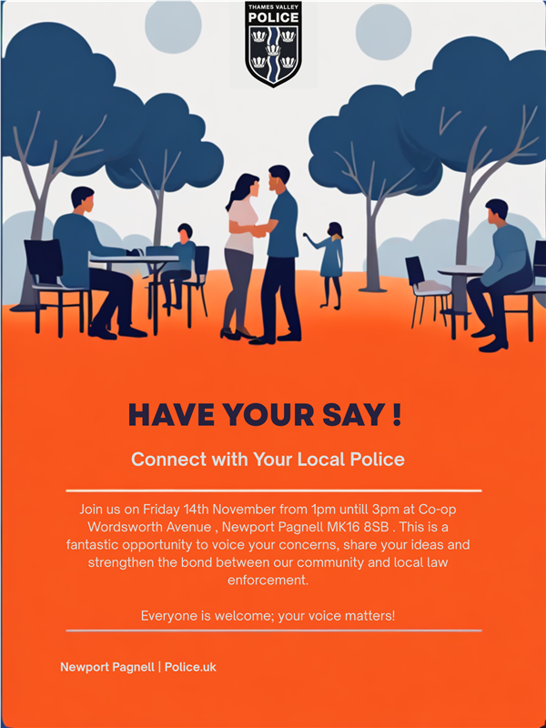 Your local Neighbourhood Team will be at CO-OP, Wordsworth Avenue, Newport Pagnell from 1pm - 3pm on Friday 14th November . Please take this opportunity to raise any concerns you may have and to find out what we are doing to tackle the issues that matter to you.