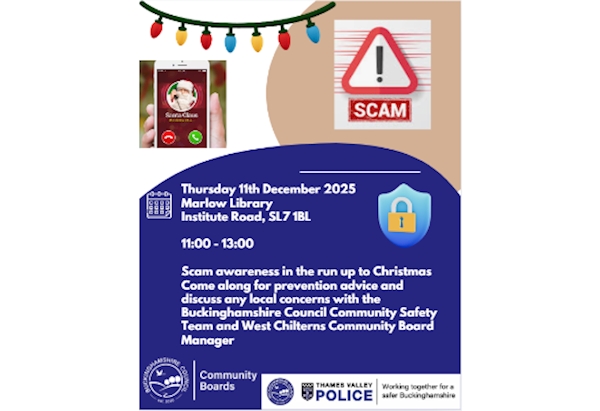 Representatives of the Marlow neighbourhood policing team will be joining Bucks Council community team and West Chilterns Community Board to hold a scam awareness event. If you'd like to discuss scams or just any concerns for your local area, please feel free to come along.
