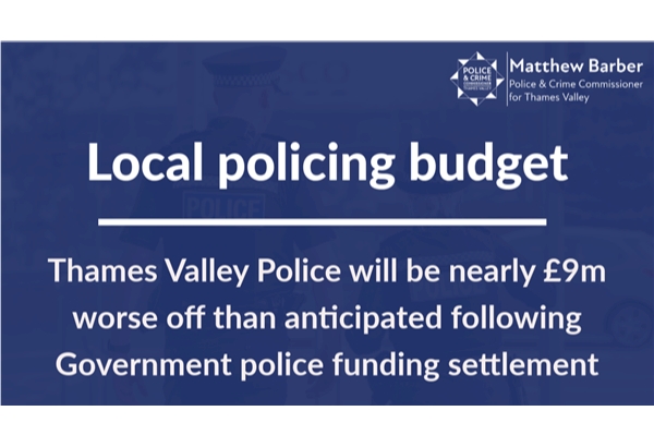 Police and Crime Commissioner, Matthew Barber said: “This settlement is terrible news for Thames Valley Police. While the Government push headlines claiming they are investing more in policing the harsh reality is that the settlement means nearly £9m less than we were expecting. Even with the significant burden the Government are looking to pass on to local council taxpayers this still leaves a huge gap in our funding plans for policing next year. I am appalled by the way the Government has handled this process which leaves Forces struggling to balance budgets and is in complete contradiction to the Government’s own Comprehensive Spending Review.