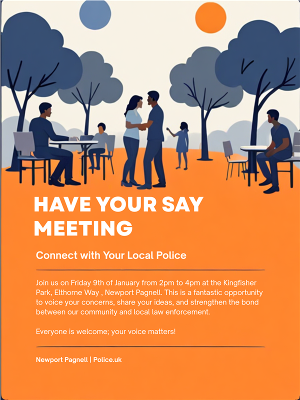 Your local Neighbourhood Team will be at Kingfisher Park, Elthorne Way, Newport Pagnell, on Friday 9 January 2026, from 2pm to 4pm.
