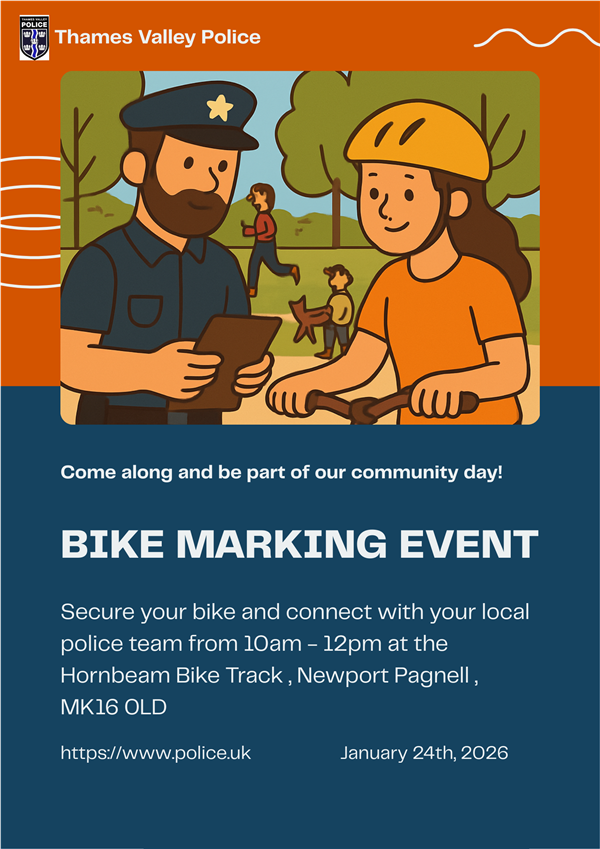 Dear all, Your local Neighbourhood Team will be at the Newport Pagnell Bike Track, Hornbeam, Newport Pagnell MK16 0LD on 24 January, from 10am until noon, for a bike‑marking event. This is a great chance to help protect your bike and keep your property safe. You’re also welcome to speak with the team about any concerns in your area and learn more about the work we’re doing to address the issues that matter most to you. Everyone is welcome — we’d love to see you there. For more information, please refer to (Newport Pagnell | Police.uk) | Bike Marking Event | Bike marking event 10:00AM - 12:00PM, Sat 24 January 2026